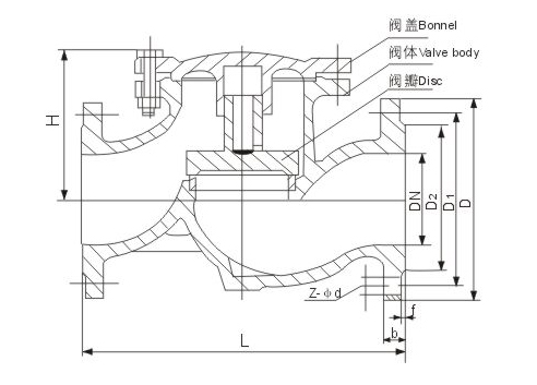 1, when the medium flows into the valve body by the arrow of the body, the pressure of the medium acts on the valve flap to generate an upward thrust force, and when the medium thrust force is greater than the gravity of the valve flap, the valve is opened. When the valve medium pressure on the role of the valve with the force of the valve itself is greater than the pressure before the valve pressure on the role of the valve, the valve closed to prevent the media back.