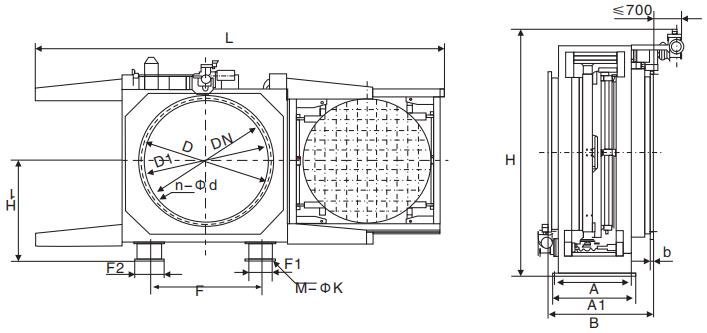 | DN | D | D1 | B | b | nd | H | H1 | L | A | A1 | F | F1 | F2 | MK | Electric power (kw) | Quality (kg) | ||||